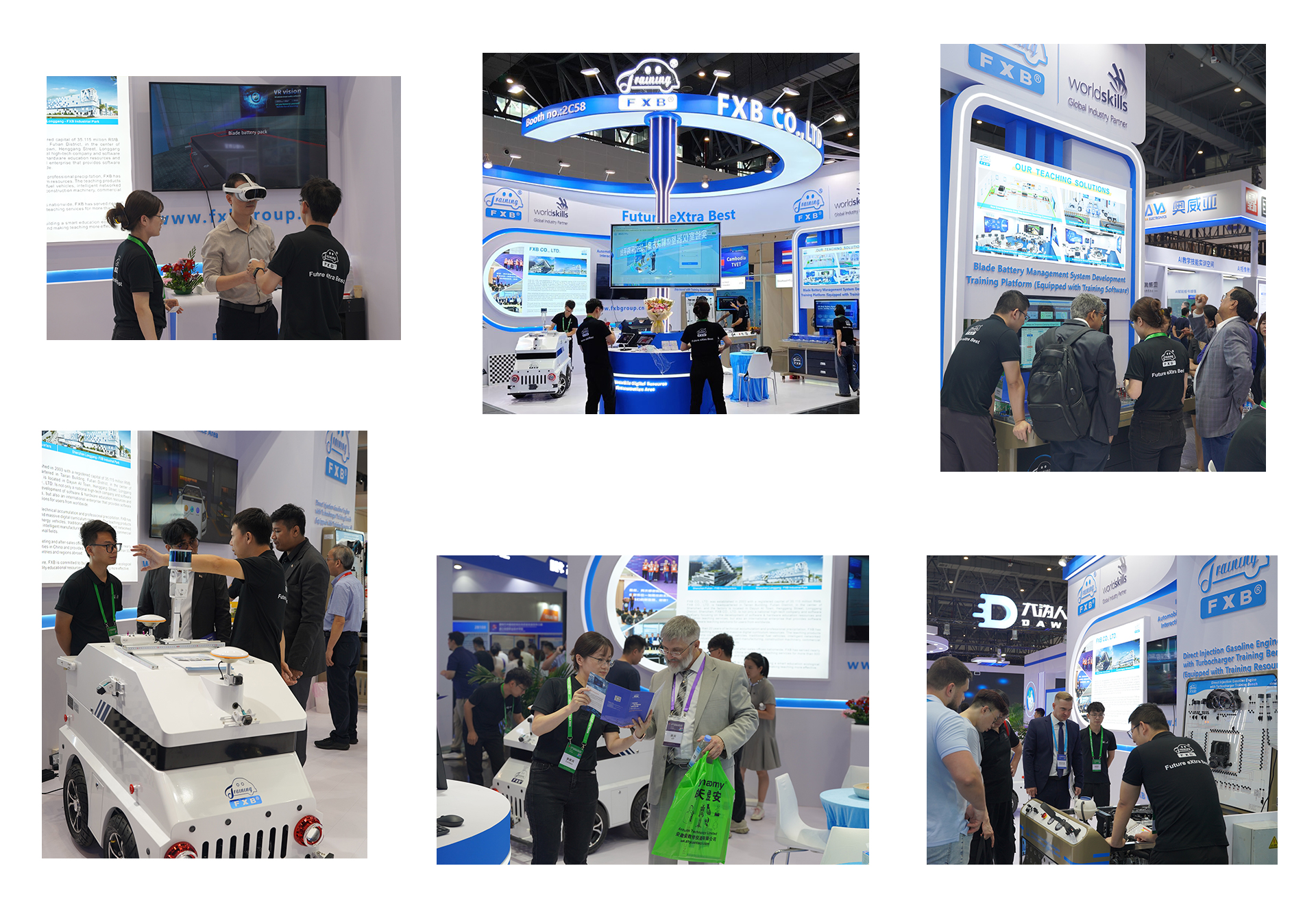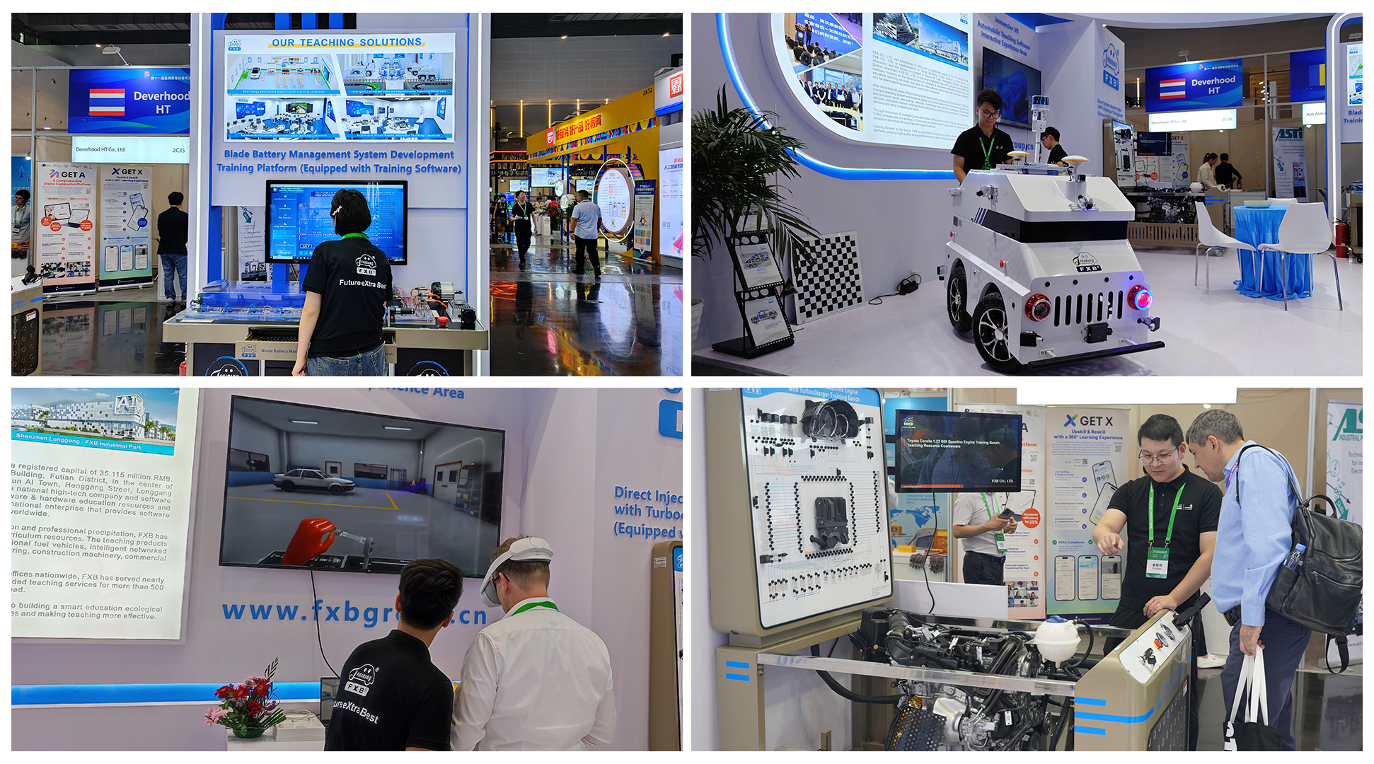 The FXB exhibition area focused on displaying the Blade Battery Management System Development Training Platform and the L4 Level Autonomous Driving Training Platform, Direct Injection Gasoline Engine with Turbocharger Training Bench, and immersive virtual simulation training software. These innovative technologies fully embody FXB's advanced teaching philosophy of "integrating hardware and software, integrating virtual and real experiences." They not only echo the exhibition's theme of "Technology Empowers Sustainable Development in Education," but also contribute to the export of high-quality Chinese technological solutions and intelligent practices to the international vocational education sector.