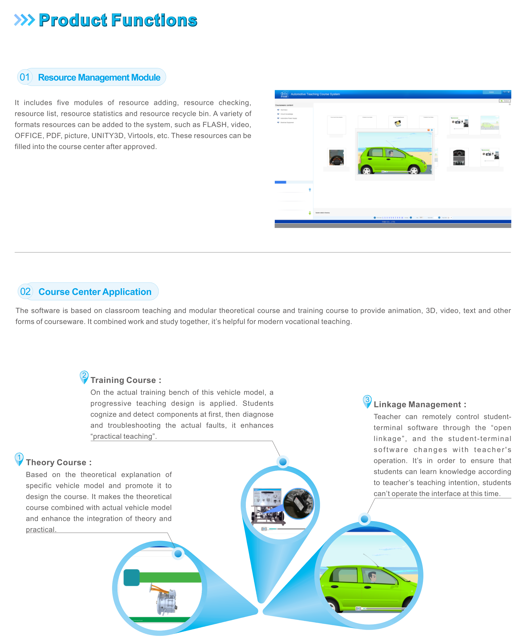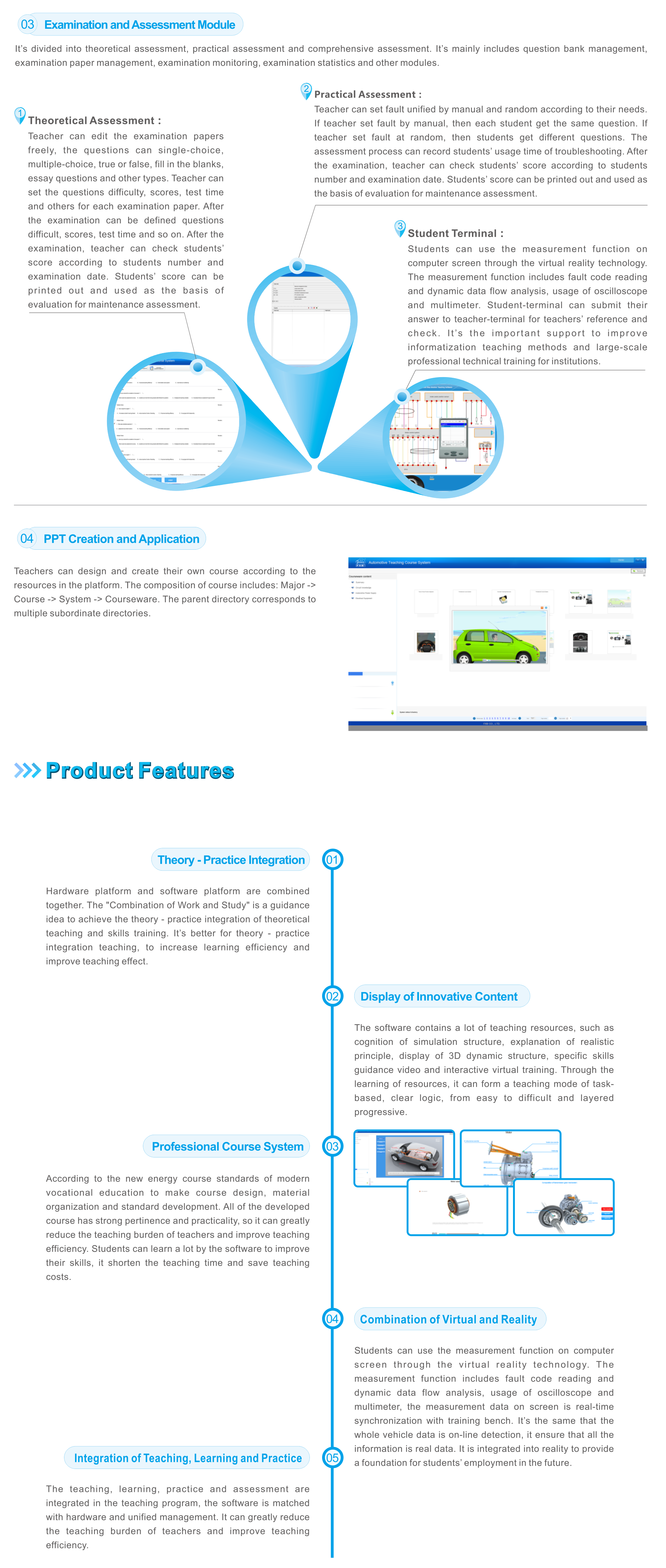 The Motor and Motor-driven System Course has a detailed introduction about types, structure, working principle and inspection method of motor system. The software has teacher-terminal and student terminal. Teacher terminal includes resource management module, course center module, examination and assessment module, PPT creation module and system management module. Student terminal includes course center module, training guiding module and examination assessment module.