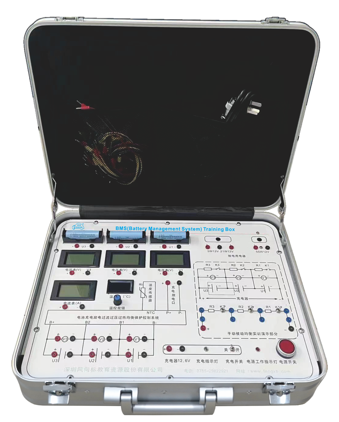6) Manual demonstration of passive balancing process: Through the passive balancing principle circuit diagram on the panel, connect the battery, voltmeter, discharging resistor and control switch to fully demonstrate the process and working principle of passive balancing.